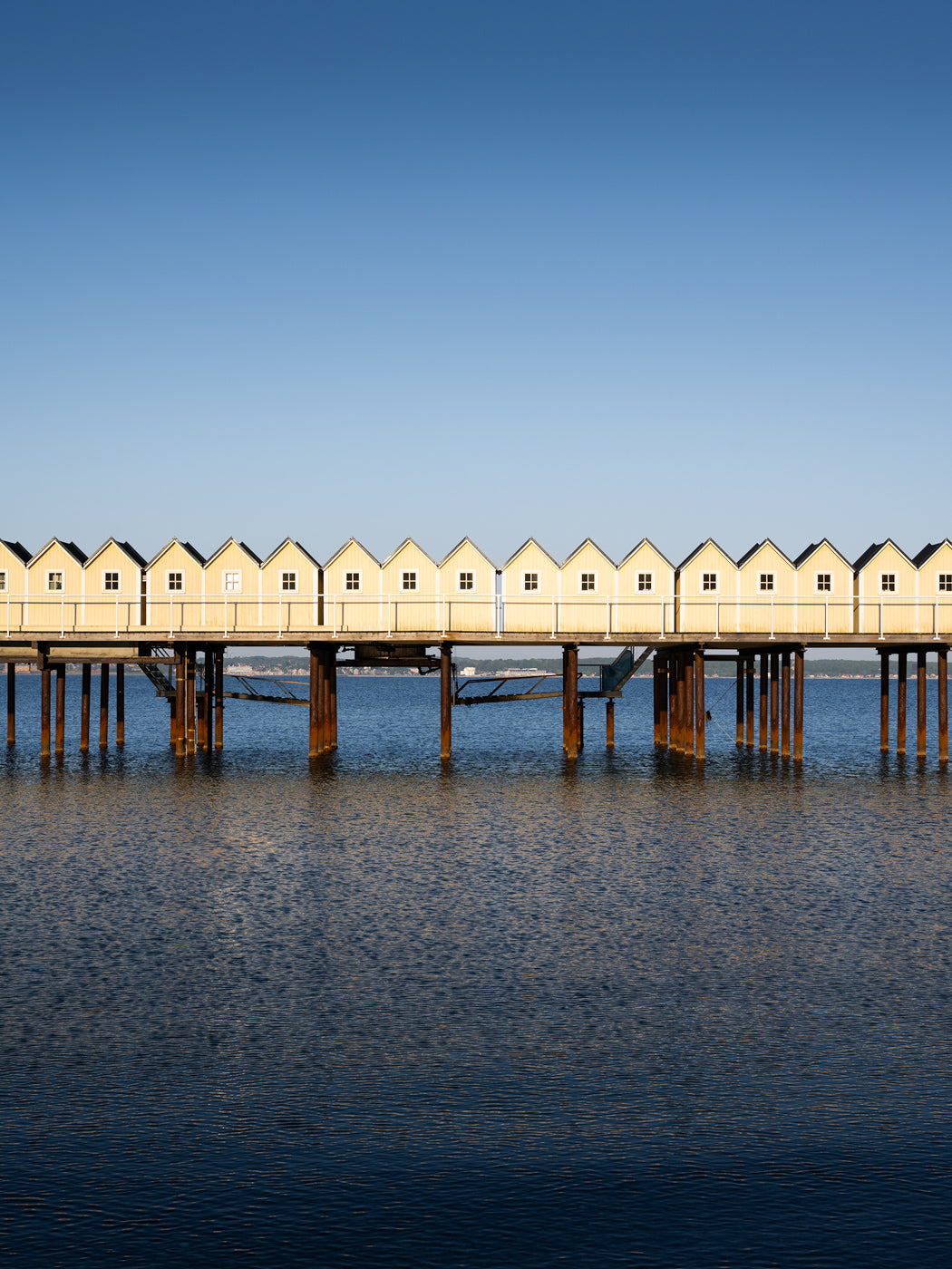 Lugn morgon över Pålsjöbaden där den blå himmeln speglar sig i havet.