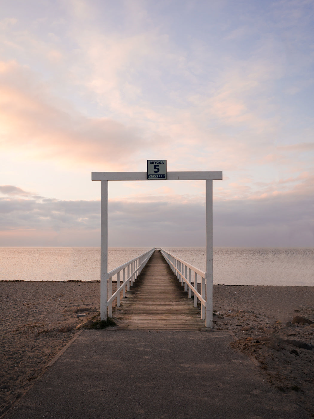 Brygga 5 sträcker sig ut ifrån Ribersborgsstranden ut mot solnedgången över Öresund.