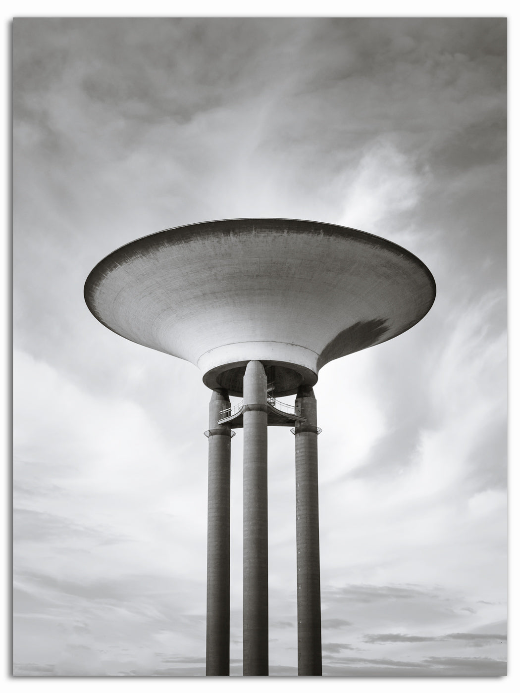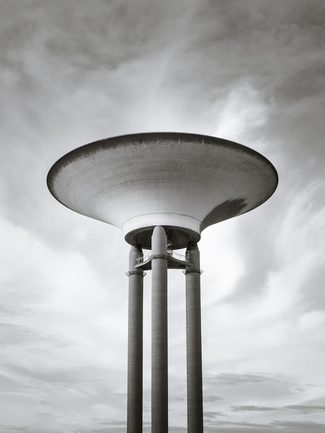 Landskronas nya vattentorn välkända silhuett tornar upp sig under en blå himmel.