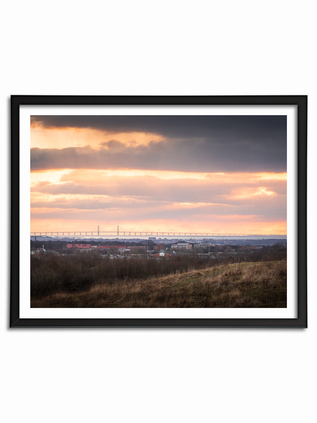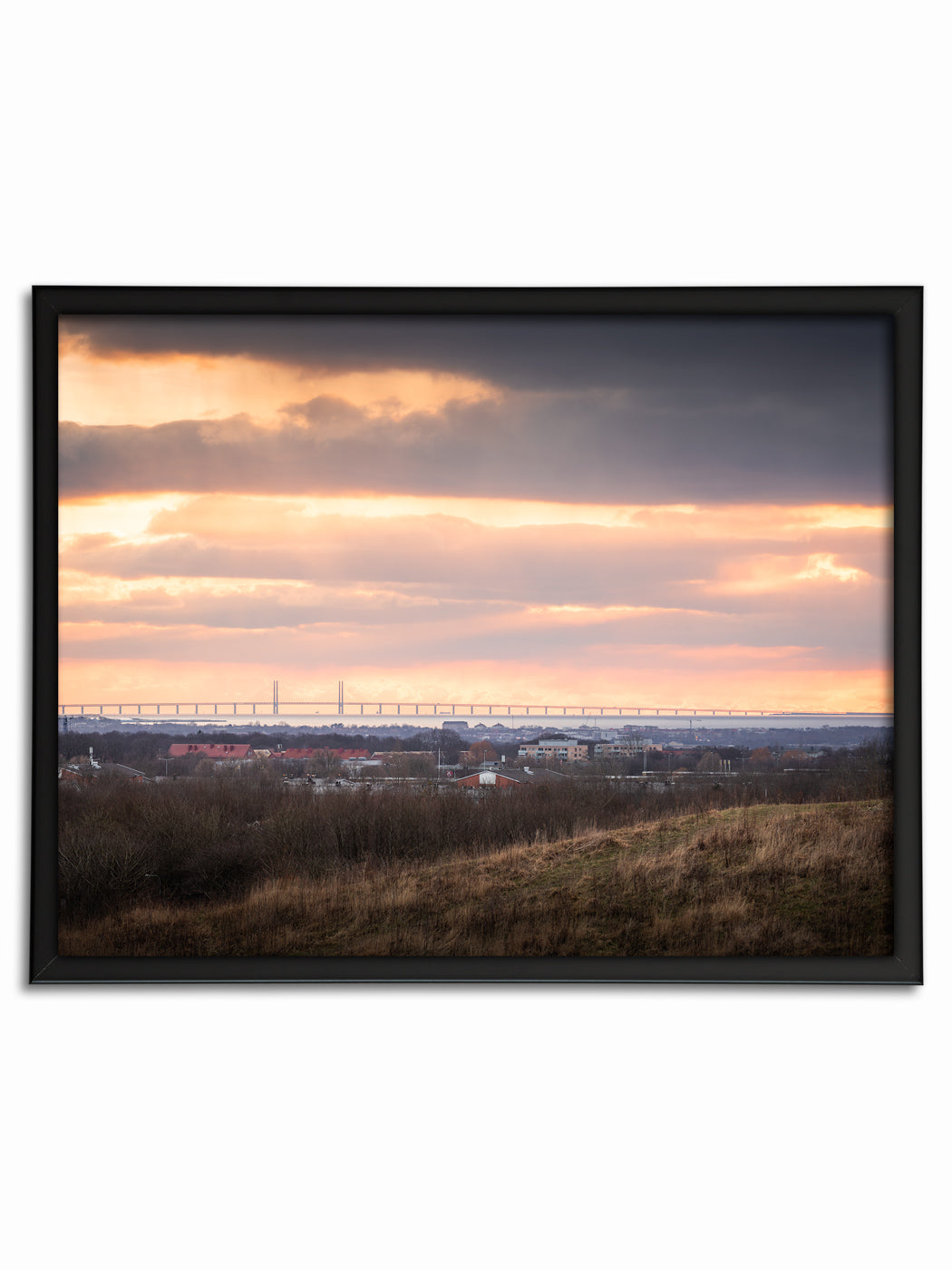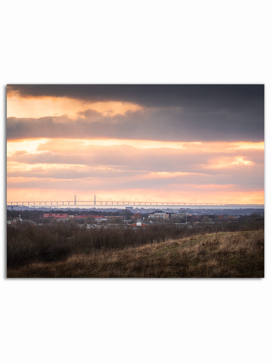 Ifrån toppen Sankt Hans Backar ser man hela vägen ut över Öresund och en fantastisk solnedgång sänker sig ner över Öresundsbron.